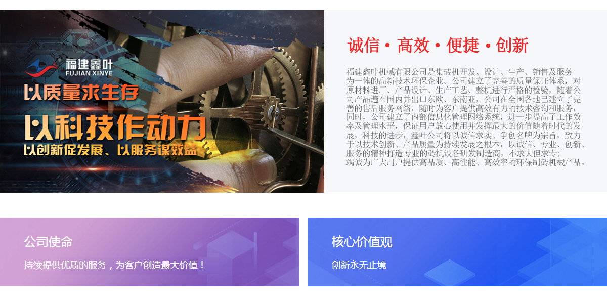 多年來公司始終堅持以人為本、以質(zhì)量求生存、以科技作動力、以創(chuàng)新促發(fā)展、以服務(wù)謀效益的經(jīng)營理念。矢志耕耘,追求卓越,止于至善的企業(yè)精神,創(chuàng)造需求,服務(wù)社會為鑫葉機(jī)械走向世界奠定堅實的基礎(chǔ)。公司積極引進(jìn)德國及同行先進(jìn)技術(shù)開發(fā)磚機(jī)設(shè)備,為提升我公司的市場競爭力提供強(qiáng)大動力。公司建立了完善的質(zhì)量保證體系,對原材料進(jìn)廠、產(chǎn)品設(shè)計、生產(chǎn)工藝、整機(jī)進(jìn)行嚴(yán)格的檢驗,隨著公司產(chǎn)品遍布國內(nèi)并出口東歐、東南亞,公司在全國各地已建立了完善的售后服務(wù)網(wǎng)絡(luò),隨時為客戶提供高效有力的技術(shù)咨詢和服務(wù),同時,公司建立了內(nèi)部信息化管理網(wǎng)絡(luò)系統(tǒng),進(jìn)一步提高了工作效率及管理水平,保證用戶放心使用并發(fā)揮最大的價值隨著時代的發(fā)展,科技的進(jìn)步,鑫葉公司將以誠信求實、爭創(chuàng)名牌為宗旨,致力于以技術(shù)創(chuàng)新、產(chǎn)品質(zhì)量為持續(xù)發(fā)展之根本,以誠信、專業(yè)、創(chuàng)新、服務(wù)的精神打造中國最專業(yè)的磚機(jī)設(shè)備研發(fā)制造商,不求大但求專;竭誠為廣大用戶提供高品質(zhì)、高性能、高效率的環(huán)保制磚機(jī)械產(chǎn)品。